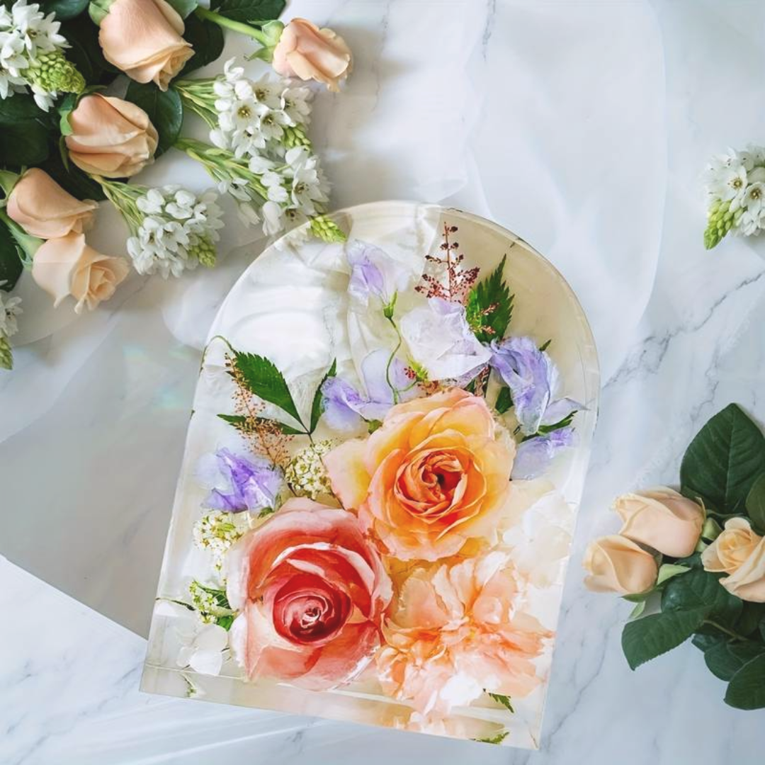 At Dahlia & Rose, we offer bespoke bouquet preservation across the UK, transforming your real wedding flowers into elegant resin keepsakes. Each piece is handmade using your dried bouquet to create timeless pieces. With a range of design options including floral arches, book ends, coasters, tables and more, there's something for everyone.